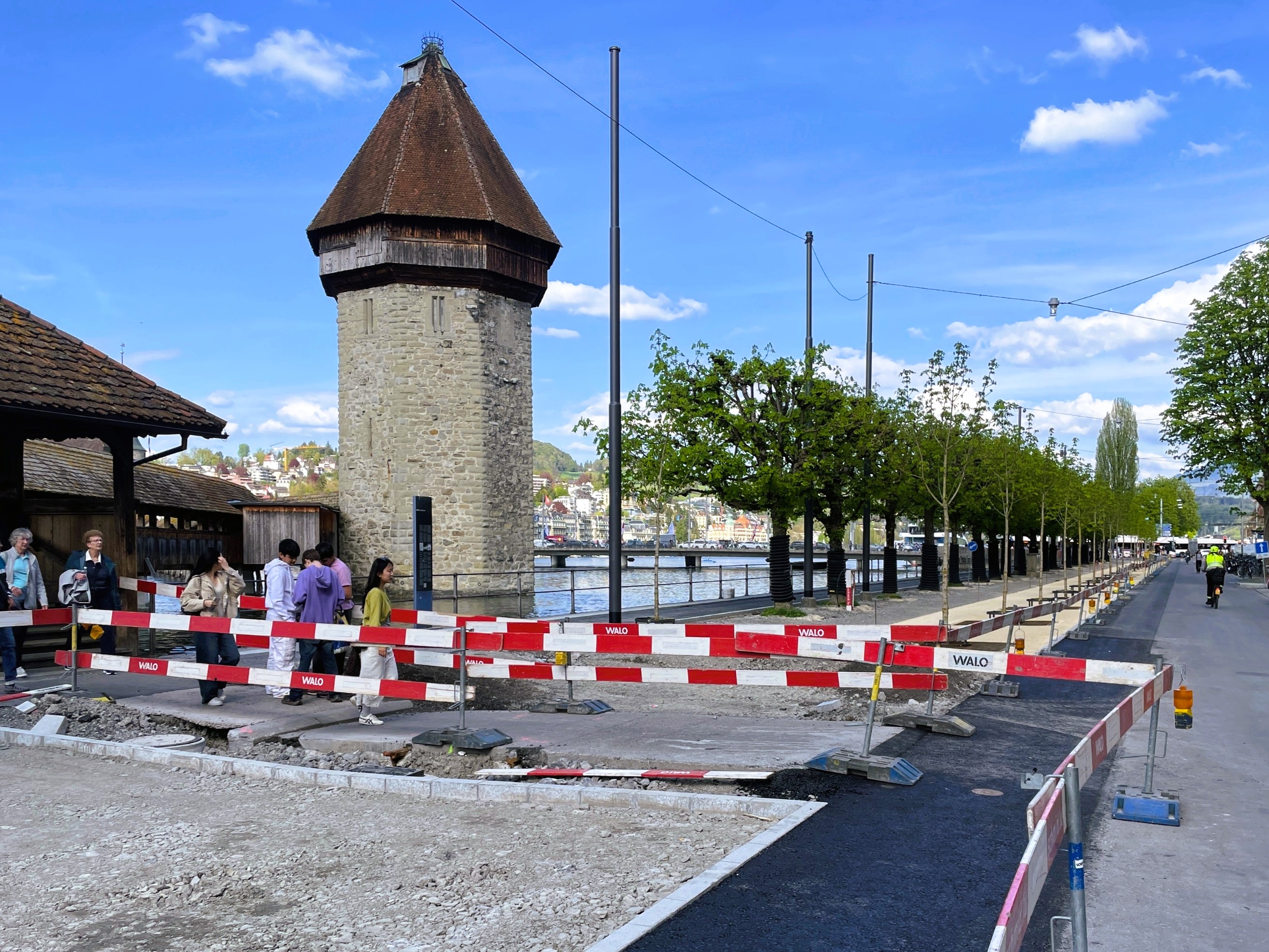 An der Bahnhofstrasse in Luzern laufen die Bauphasen 4 und 5 auf Hochtouren. Ein erster Abschnitt der stabilisierten Kiesfläche konnte bereits eingebaut werden. Zudem wurde ein Teil der zweiten Baumreihe vom Knoten Seebrücke bis zur Kappelbrücke erfolgreich versetzt. Damit ist die spätere Endgestaltung bereits gut erkennbar.